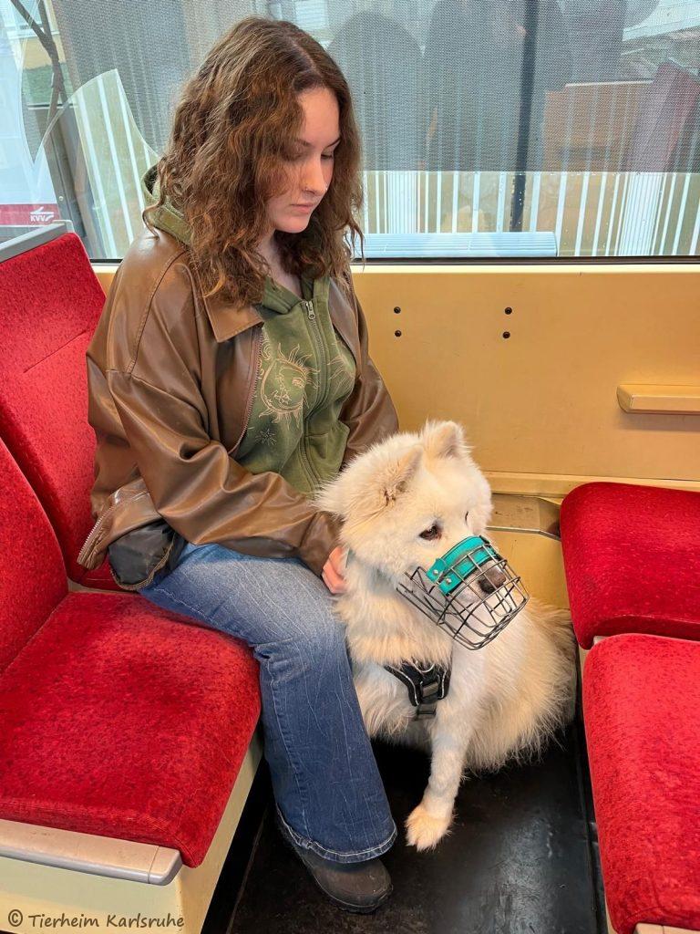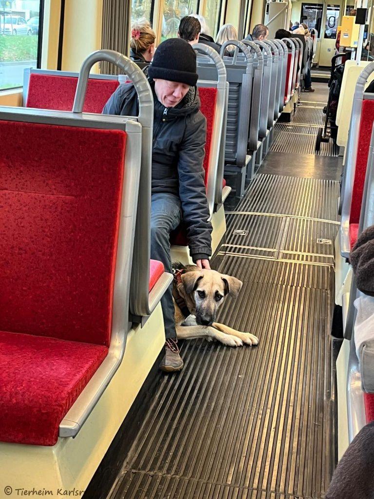 Gemeinsam starteten Antonella Zilli und die Ehrenamtlichen als kleine Gruppe und machten sich mit der Bahn auf den Weg in die Karlsruher Innenstadt. Für die Hunde war bereits die Bahnfahrt eine spannende und neue Erfahrung, welche alle mit Bravour gemeistert haben!