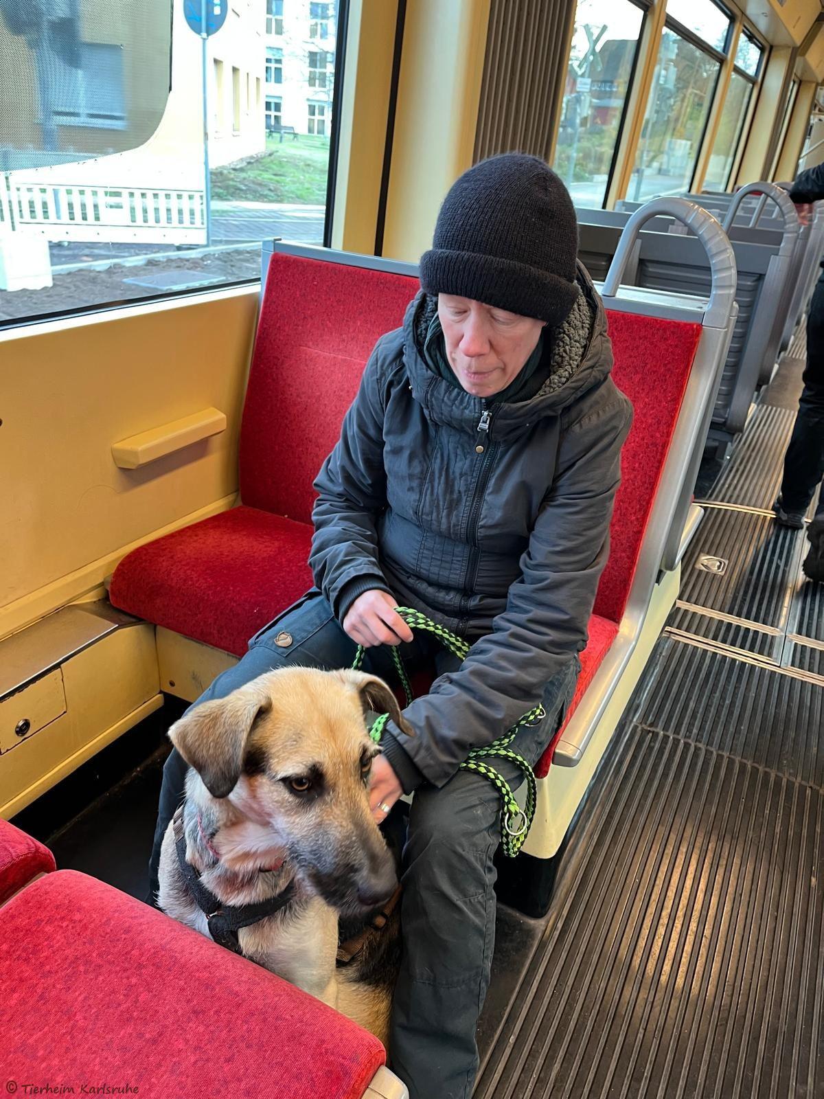 Gemeinsam starteten Antonella Zilli und die Ehrenamtlichen als kleine Gruppe und machten sich mit der Bahn auf den Weg in die Karlsruher Innenstadt. Für die Hunde war bereits die Bahnfahrt eine spannende und neue Erfahrung, welche alle mit Bravour gemeistert haben!