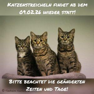 Erfahrene Katzenliebhaber (Kinder ab 14 Jahre und nur in Begleitung mit einem Erwachsenen) sind bei uns herzlich eingeladen zum Katzenstreicheln zu uns zu kommen.Das Katzenstreicheln findet immer:Montags 14:15 Uhr – 15:15 UhrMittwochs 14:15 Uhr – 15:15 UhrFreitags 14:15 Uhr – 15:15 UhrSamstags 11:30 Uhr – 14:00 Uhrund Sonntags 11:30 Uhr – 14:00 Uhrsowie an allen Feiertagen, die nicht auf einen Dienstag oder Donnerstag fallen von 11:30 Uhr – 14:00 Uhr statt.An unseren Tierheimfesten sowie am 24.12. – 26.12. und 31.12. – 01.01. findet KEIN Katzenstreicheln statt.Der Sozialkontakt ist für unsere Schützlinge sehr wichtig, daher freuen wir uns auf ihren Besuch.Haben wir Ihr Interesse geweckt? Wenn ja, melden sie sich bitte zu unseren Telefonzeiten 0721/950780 oder per E-Mail info@tierheim-karlsruhe.de für das Katzenstreicheln an. Bitte geben Sie für die Anmeldung immer eine Telefonnummer mit an. Die Anmeldung kann aufgrund des stetig wechselnden Katzenbestands immer nur für die aktuelle Woche und für die darauffolgende Woche erfolgen.