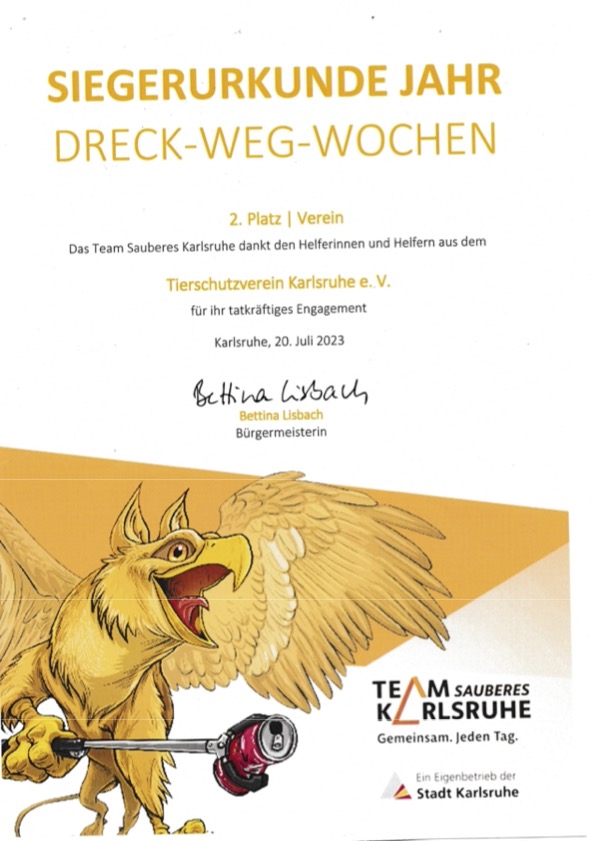 mit dem großartigen Engagement unserer ehrenamtlichen HelferInnen haben wird den 2. Platz beim Dreck-Weg-Tag gewonnen. :o) Wir haben gar nicht damit gerechnet, haben uns aber sehr über die Auszeichnung gefreut. Erwähnenswert ist, dass wir auch außerhalb der Dreck-Weg-Wochen fleißig sind und immer mal wieder Müll beim Gassigehen sammeln. Wir sind so quasi das ganze Jahr über aktiv, um das Umland rund um das Tierheim sauber zu halten.