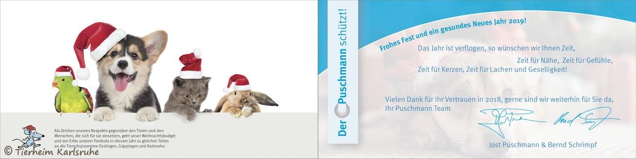 Am 10.12.18 erhielten wir die Nachricht von der Firma Puschmann, dass es auf der Weihnachtsfeier der Mitarbeiter eine Tombola gab und der Erlös an uns und zwei weitere Tierheime gespendet wird. Durch den Losverkauf und einem Zuschuss der Firma bekam jedes Tierheim 1500 Euro als Spende überwiesen. Wir waren überwältigt, da wir mit dieser Summe gar nicht gerechnet hatten. :o)