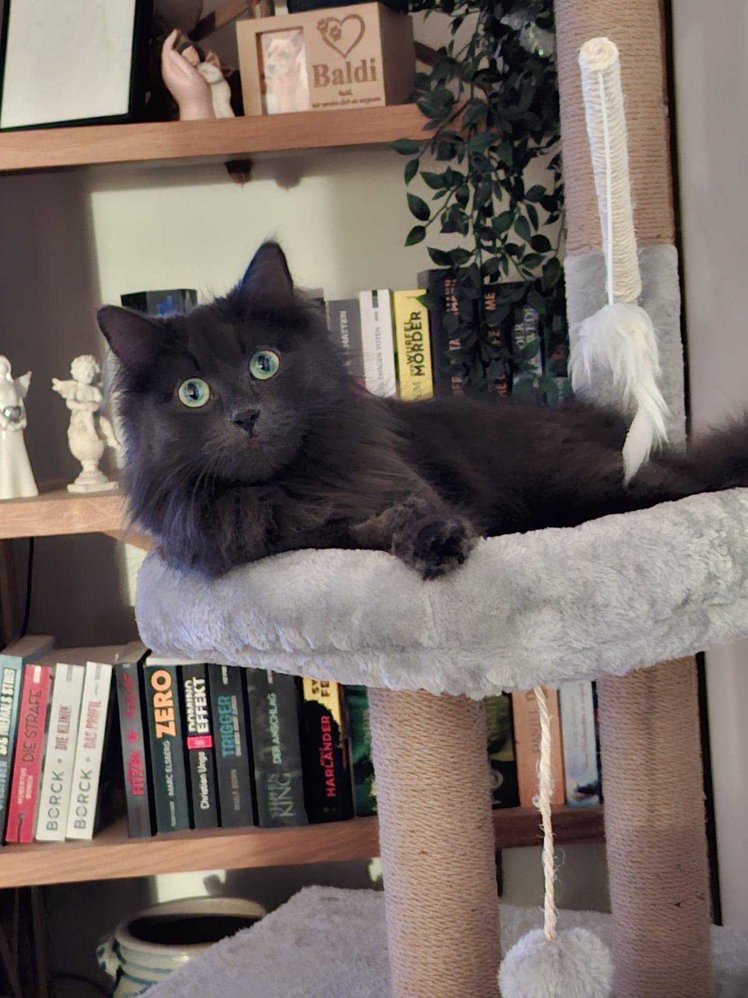 Es ist jetzt fast 3Wochen her, als Zelda, jetzt Nyla, bei uns eingezogen ist. Die Eingewöhnung hat super geklappt denn Nyla hat es uns auch nicht schwer gemacht. Von Anfang an benutzt sie zuverlässig ihr Katzenklo und auch fressen war kein Problem, wenn man ihre Vorlieben beachtet. Anfangs fraß sie etwas zurückhaltend aber seit einer Woche hat sie ordentlich Appetit. Am liebsten liegt sie auf ihrem Platz auf dem Schrank, denn dort hat sie den kompletten Blick über ihr Revier. Abends kuschelt sie gerne nah bei uns und hat sich zur Dauerschnurrerin entwickelt.