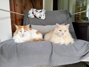 Nach seiner akrobatischen Flucht und seinen Streitbarkeiten mit der vorhandenen Katze sah es ja eine Weile so aus, als müsste er der Katze zuliebe wieder ausziehen. Aber diese gedachte Drohung hat gewirkt. Heute sind sie (abgesehen von normalen Rangordnungsdiskussionen) gute Freunde.