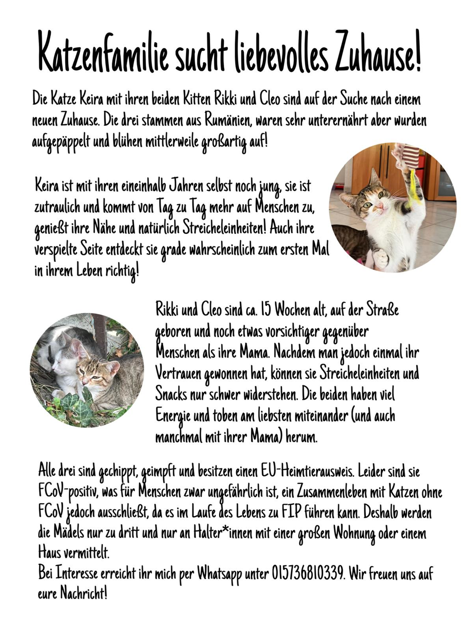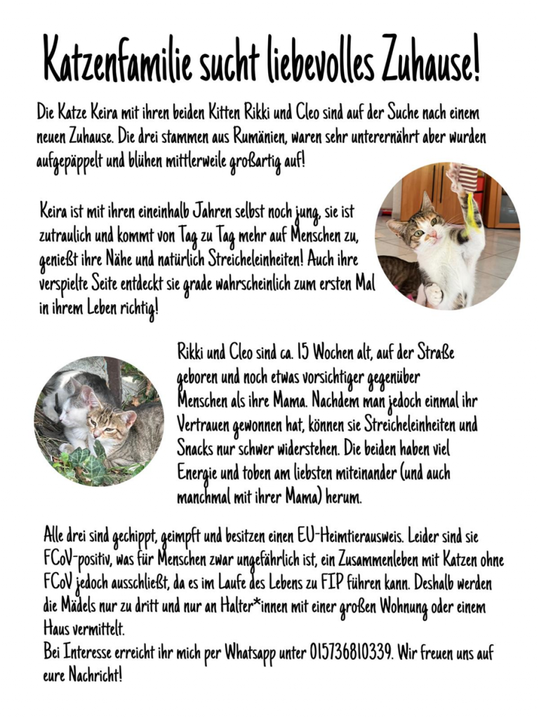Bei den hier vorgestellten Katzen handelt es sich um Tiere von anderen Tierschutzvereinen. Die Vermittlung findet daher NICHT über das Tierheim Karlsruhe statt, sondern ausschließlich über die jeweiligen Vereine. Bitte wenden Sie sich direkt an die angegebene Telefonnummer, da wir leider keine weiteren Informationen über die jeweiligen Katzen besitzen.