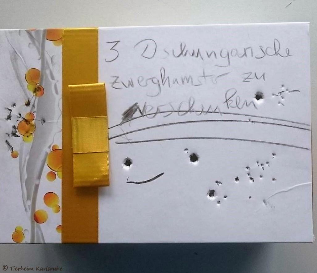 Drei Hamster in einem Geschenk- Karton ausgesetzt, auf welchem stand: